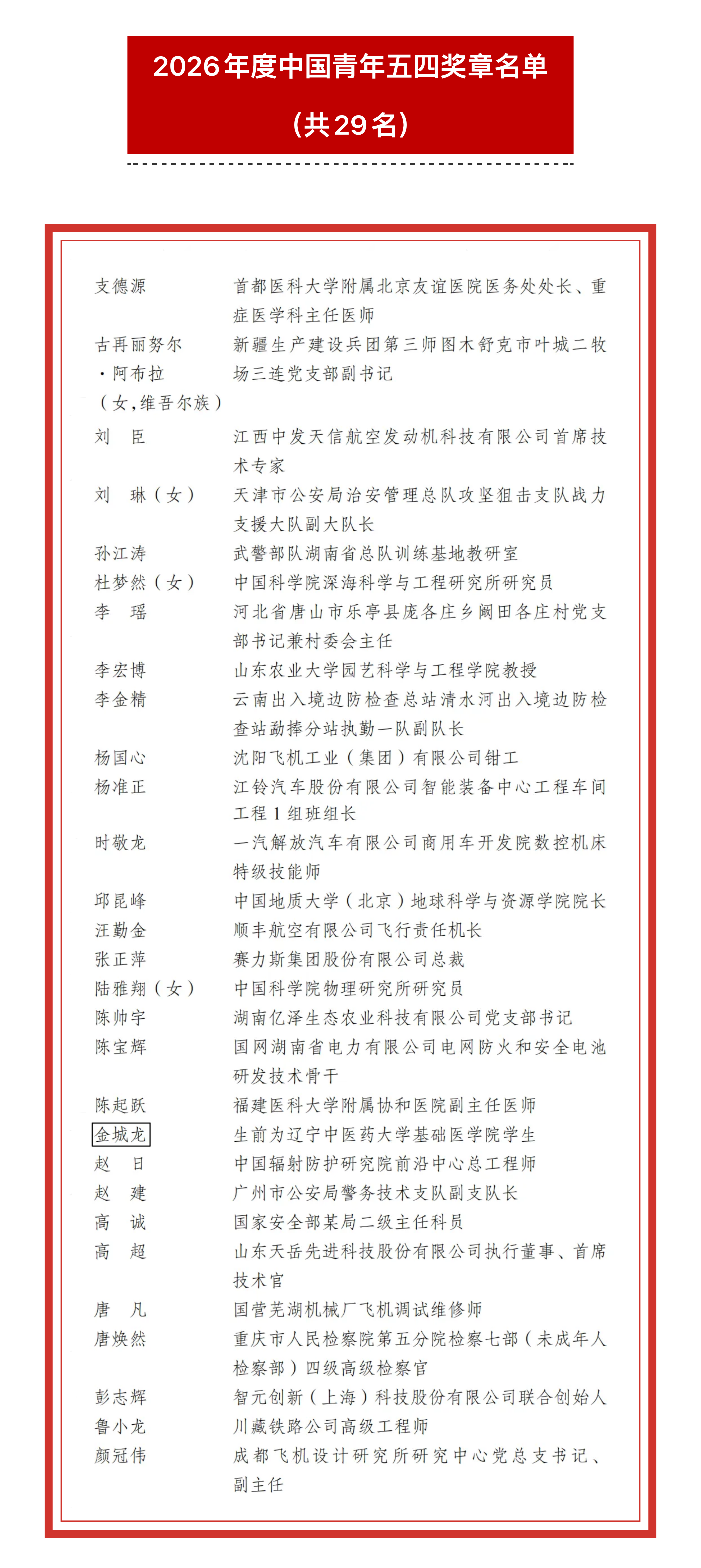 · 授予支德源、古再丽努尔·阿布拉、刘臣等29名同志中国青年五四奖章;