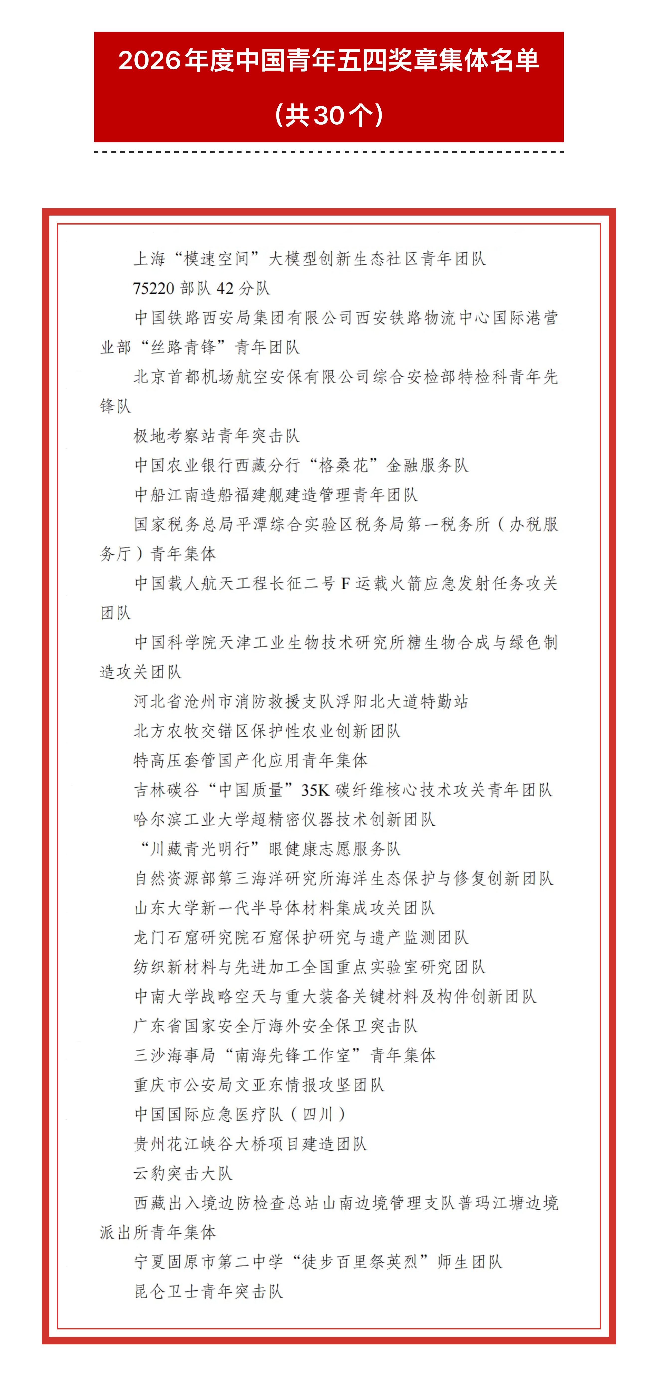 · 授予上海“模速空间”大模型创新生态社区青年团队、75220部队42分队、中国铁路西安局集团有限公司西安铁路物流中心国际港营业部“丝路青锋”青年团队等30个青年集体中国青年五四奖章集体;